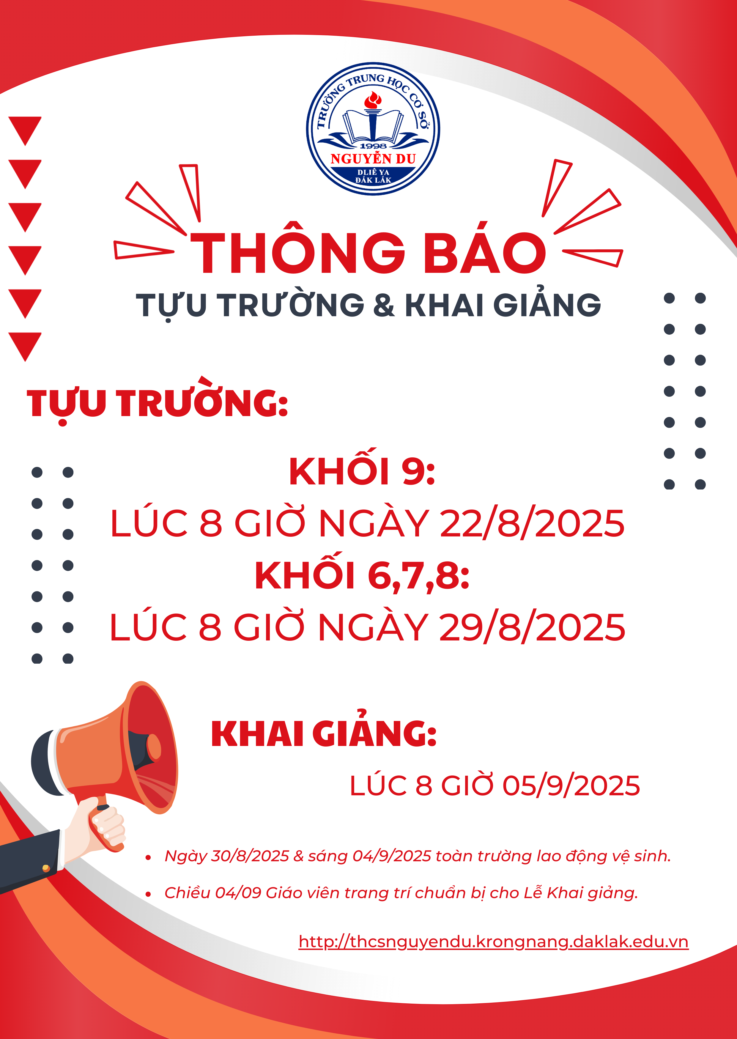 THÔNG BÁO LỊCH TỰU TRƯỜNG VÀ KHAI GIẢNG NĂM HỌC 2025 - 2026.